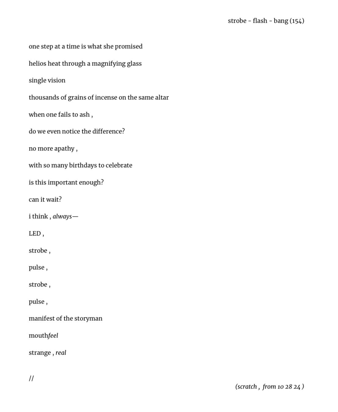 strobe - flash - bang (154) one step at a time is what she promised helios heat through a magnifying glass single vision thousands of grains of incense on the same altar when one fails to ash , do we even notice the difference? no more apathy , with so many birthdays to celebrate is this important enough? can it wait? i think , always — LED , strobe , pulse , strobe , pulse , manifest of the storyman mouthfeel strange , real // (scratch , from 10 28 24 )